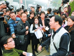 在昨天審理肖傳國(guó)一案的同時(shí),法院大門外也上演著一場(chǎng)“庭審”:接受肖氏術(shù)的患者和家屬以及肖傳國(guó)的支持者都自稱自發(fā)來(lái)到法院,形成兩個(gè)鮮明陣營(yíng),將原本在網(wǎng)上互相發(fā)帖拍磚的論戰(zhàn)搬到了這里。
