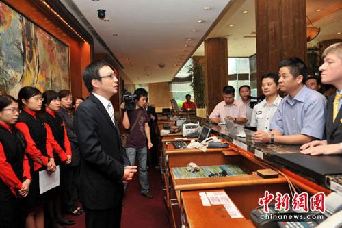 6月20日,重慶希爾頓酒店因股東涉黑,介紹、容留婦女賣淫,違法經(jīng)營(yíng)和故意擾亂社會(huì)秩序,被重慶警方責(zé)令停業(yè)整頓。今日上午,重慶市公安局副局長(zhǎng)高曉東帶領(lǐng)市局治安、經(jīng)偵、消防、打黑辦等部門相關(guān)負(fù)責(zé)人組成的檢查驗(yàn)收組,對(duì)重慶希爾頓酒店整改情況進(jìn)行檢查驗(yàn)收。