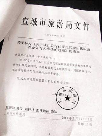 記者向當(dāng)?shù)芈糜螛I(yè)界人士了解了一些情況,據(jù)說整個宣城市,包括涇縣在內(nèi),沒有一家旅行社具備組織出境游的資格。當(dāng)?shù)芈眯猩缱疃酁楹戏、南京等地旅行社做代理攬客的業(yè)務(wù)。