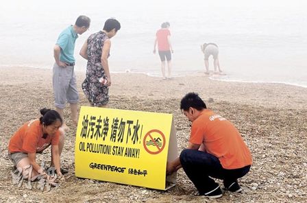 環(huán)保組織綠色和平昨日指出,受漏油意外污染的大連一帶海域,黑色油污已漸被清理,但海面仍漂浮油層。為保護游客安全,綠色和平在棒棰島等海濱浴場已豎立警示牌,提醒游人“油污未凈,請勿下水!”