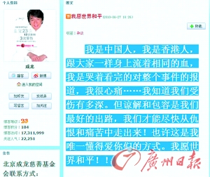 成龍于本月25日透過助手,在Twitter上就香港旅客在菲律賓被挾持事件抒發(fā)己見,想不到卻變成香港市民批評(píng)的眾矢之的。成龍前日終于發(fā)表聲明,在聲明中他表示,之前自己的言論是因?yàn)槊绹址g不完整而引起誤會(huì)。