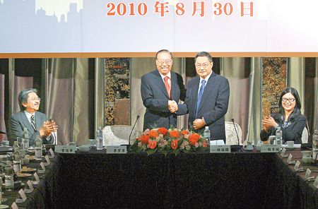 臺港兩會第一次聯(lián)席會議昨日上午在晶華酒店舉行,包括“陸委會正副主委”賴幸媛、高長、趙建民、策進會董事長林振國、香港財政司司長曾俊華、協(xié)進會主席李業(yè)廣、香港政制及內地事務局局長林瑞麟等逾四十位兩會成員參加,達成七項合作共識。