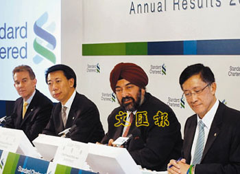 二月二十六日,渣打集團(tuán)在香港舉行二零零七年度全年業(yè)績發(fā)布會。集團(tuán)在二零零七年全年盈利錄得增長百分之二十五(25%),達(dá)二百一十九點四一億港元(219.41),其中經(jīng)營收入八百六十三點二三億港元(863.23),增長百分之二十八(28%)。在香港業(yè)務(wù)方面,渣打香港除稅前營利九十三點零五億港元(93.05),上升百分之三十四(34%),經(jīng)營收入有一百六十一點三億元(161.3),增長百分之二十八(28%)。圖為渣打集團(tuán)高層出席業(yè)績發(fā)布會。 中新社發(fā) 鄧慶樂 攝