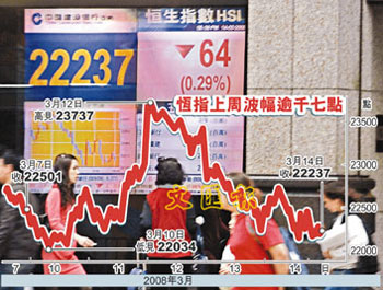 中新網(wǎng)3月17日電 據(jù)香港文匯報報道,受到貝爾斯登資金周轉(zhuǎn)不靈的消息拖累,美股大插近200點,一眾以美國預托證券(ADR)形式上市的港股也全線受挫。有香港證券界人士預計,18日港股將低開約500點,即下試今年低位21709點。
