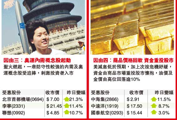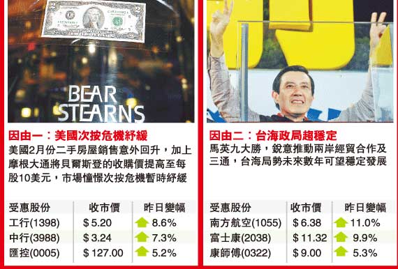 國指方面更跑贏恒指升幅6.43%,收市升890點或8.22%,收報11727點,建行、工行及中壽均升近9%,三股已推高國指逾300點。值得留意的是,除次按危機舒緩令內地及本地金融股做好外,銳意推動兩岸經貿的馬英九大勝,以及奧運進入圣火傳遞的最后階段,令“三通”及奧運概念股頓成追捧對象,個別股份勁升逾20%。