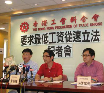 工資保障運(yùn)動(dòng)推行超過(guò)年半以來(lái)成效不彰,立法規(guī)管最低工資似乎勢(shì)在必行。工聯(lián)會(huì)理事長(zhǎng)黃國(guó)健、立法會(huì)議員王國(guó)興和權(quán)益委員會(huì)主任葉偉明9日一同召開(kāi)記者會(huì),公布該會(huì)研究部就立法規(guī)管最低工資的研究結(jié)果。