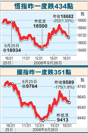 富昌證券總經(jīng)理藺常念表示,美國仍未通過救市方案,中移動母公司又被國資委抽走500億元人民幣,令市場失去信心,令中移動26日急跌3%。他形容,投資者目前對后市悲觀,紛紛不計價格地出貨套現(xiàn),就算內(nèi)地股市跌勢喘定,但美股走勢疲弱下,港股后市絕不樂觀,所以他預(yù)計,大市下周將逐步回落至18000點水平。