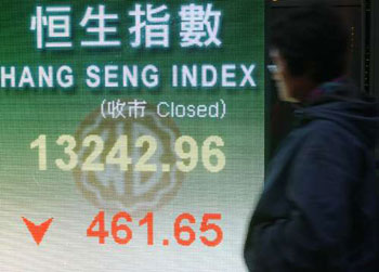 華爾街股市日前急挫3%,環(huán)球股市再現(xiàn)骨牌式的下跌,韓國(guó)股市暴跌超過(guò)6%,日股挫近5%,香港股市也難逃一劫,加上“大笨象”匯控被“摩笛”嚇倒,拖累恒指15日裂口低開568點(diǎn),開市不足10分鐘,恒指在13000點(diǎn)岌岌可危,在中午收市前最多暴跌800點(diǎn)至12904點(diǎn)低位。