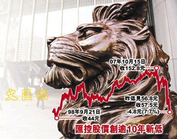 匯控單日急挫7.7%,圖表顯示其有跡象下試50元以下水平,但白韌認(rèn)為,匯控跌穿60元已經(jīng)接近底部,雖然匯控表示沒有財(cái)政壓力,但卻受制于市場(chǎng),若早些宣布集資,反而可掃除其不明朗因素。7天以來匯控股價(jià)已下跌23%,市值因而蒸發(fā)2062億元。