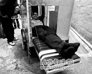 記者在策展人鐘宏亮引領(lǐng)下參觀了整個展覽,發(fā)現(xiàn)了不少充滿新意的作品。在女子監(jiān)獄外的名為《工作/空間/再工作/時間》的作品儼然一棟房子,但全部由一塊塊黑色薄木板拼建成,透過木板間的間隙可以看到建筑里的人在活動,而整個建筑又相當結(jié)實,人可以從“樓梯”登上房子的二樓。名為《流浪家居》的作品,作者甚至設(shè)計了一輛“房車”,不過是流浪者的“房車”,由自行車帶動,“房車”麻雀雖小,五臟俱全,里面有窗有門,有柜子有凳子,通過拼接還可以組成一張床,作者現(xiàn)場向大家講解時還興奮地拼起床躺了下來。(馮悅)