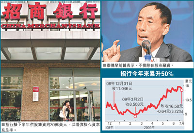 交銀國際研究部主管楊青麗表示,為提高核心資本充足率,招行只能選擇股本集資的方式,即在二級市場供股或對大股東定向增發(fā)。