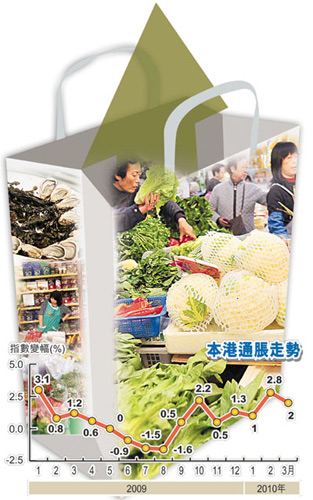 港府發(fā)言人預(yù)測,隨著經(jīng)濟(jì)復(fù)蘇,未來通脹壓力勢必增加。學(xué)者分析認(rèn)為,種種激化通脹的因素已經(jīng)逐漸浮現(xiàn),包括內(nèi)地旱情持續(xù)、人民幣升值、歐洲航班停航令歐洲產(chǎn)品供應(yīng)緊張等,預(yù)計香港通脹將加劇,今年內(nèi)或上升2%。