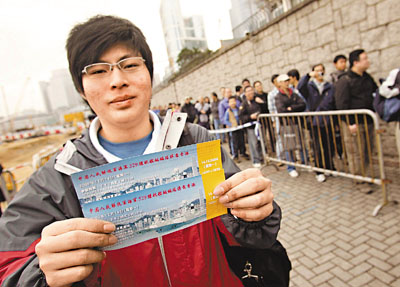 解放軍駐港部隊(duì)13日晨8時(shí)半起,在中環(huán)及槍會(huì)山兩個(gè)軍營(yíng)門外派發(fā)參觀兩艘導(dǎo)彈護(hù)衛(wèi)艦的入場(chǎng)券,每人可憑身份證領(lǐng)取最多2張入場(chǎng)券。在中環(huán)軍營(yíng)門外,未正式派發(fā)已有數(shù)百名市民在門外守候,排頭位的鄒先生更在12日晚10時(shí)開(kāi)始便已通宵輪候。有市民在領(lǐng)取2張入場(chǎng)券后,即到“龍尾”再次排隊(duì)領(lǐng)取,希望可與更多親朋好友一同參觀戰(zhàn)艦。