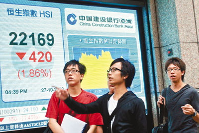中新網(wǎng)10月28日電 據(jù)香港《文匯報(bào)》報(bào)道,外圍股市跌,拖累港股在臨近期指結(jié)算前急挫,恒指27日隨美股疲軟而低開573點(diǎn),其后跌幅一度收窄至不足400點(diǎn),但午后內(nèi)地股市“插水”,大跌近3%,恒指下午再一輪下跌,結(jié)果全日跌420點(diǎn),收?qǐng)?bào)22169.5點(diǎn),跌1.86%,是三周以來最大跌幅,港股成交額739億元。