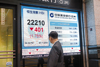 中新網(wǎng)11月27日電 據(jù)香港《文匯報(bào)》報(bào)道,市場(chǎng)擔(dān)心若迪拜世界一旦破產(chǎn),會(huì)令多間主要借款銀行,包括匯控在內(nèi)的歐洲大型銀行需要大額撇帳。亞太區(qū)股市普遍走弱,內(nèi)地及港股也不能幸免,恒指26日曾跌500點(diǎn),尾市跌幅略收窄,但也跌401點(diǎn),收22210點(diǎn),跌幅1.78%,成交773億元。