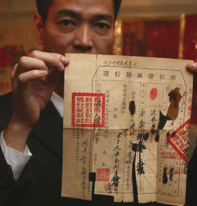 如今往來內(nèi)地香港兩地,電子過關(guān)系統(tǒng)便捷快速,原來在上世紀(jì)50年代,往來港澳通行證還要靠人手書寫。普藝拍賣有限公司副總經(jīng)理莊志崗介紹一張1953年由廣州發(fā)出的來往港澳通行證,雖然紙張已經(jīng)破損,當(dāng)中不少個人信息部分也被燒毀,但依然清晰可見當(dāng)年的發(fā)證版本和模式,尤其是所有內(nèi)容均由人手毛筆書寫,同如今發(fā)達(dá)科技下的電子版本相距甚遠(yuǎn)。
