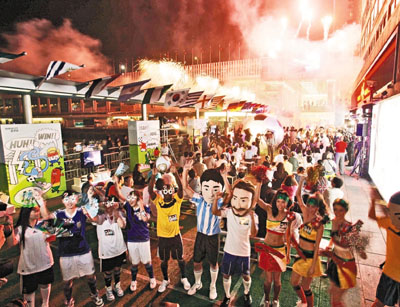 今年世界杯由收費(fèi)電視直播,有直播賽事的餐廳食肆自然成為“球迷樂(lè)園”,銅鑼灣、灣仔、旺角的大部分食肆都聚集大批球迷,有不少人穿上支持球隊(duì)的球衣,為世界杯打氣。