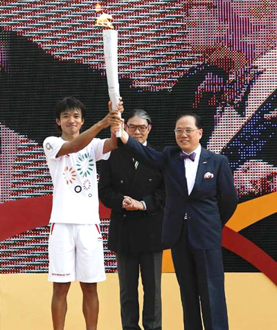 八月二十九日,東亞運(yùn)火炬接力跑在香港順利舉行,港協(xié)暨奧運(yùn)會(huì)會(huì)長霍震霆、民政事務(wù)局局長曾德成、政制及內(nèi)地事務(wù)局局長林瑞麟、民政事務(wù)局常任秘書長尤曾嘉麗等官員,及六十五名火炬接力手在灣仔金紫荊廣場舉行火炬跑閉幕儀式。 中新社發(fā) 鄧慶樂 攝
