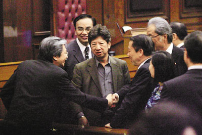 香港金融界的李國寶、專業(yè)會議的梁美芬、商界的黃宜弘、工業(yè)界的林大輝等立法會議員,在特首宣讀施政報告前,都爭相上前與其握手問好,歷時至少5分鐘,不知期間有否談及其因“小病是!保裢炊鄙氖乱。