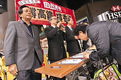民建聯(lián)在本周二開始在港島、九龍、新界發(fā)起“撐高鐵、撐香港”的簽名活動(dòng),截至14日,最少有逾3萬名市民簽名支持。中環(huán)14日短短一小時(shí)已經(jīng)收集到1100個(gè)簽名,清楚反映市民希望建高鐵的訴求。