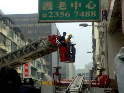 土瓜灣馬頭圍道一幢樓宇整幢倒塌,消防員架起云梯從旁邊大廈救出被困居民。消防員首先為居民綁上安全帶,然后逐個(gè)居民由云梯救落地面。