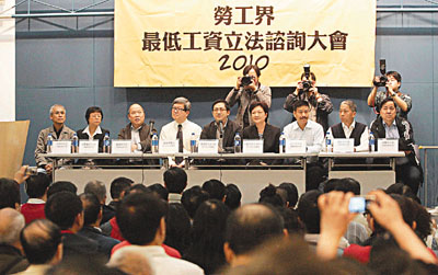 大會向所有與會者派發(fā)問卷,收集他們對最低工資水平、用膳時間應否計算入最低工資之內、工資水平應否每年檢討等的意見,并由工聯會議員潘佩璆簡介最低工資立法進度,繼由勞工顧問委員會勞方代表梁籌庭講述勞顧會對此項議題的最新進展,再由與會人士自由發(fā)言。