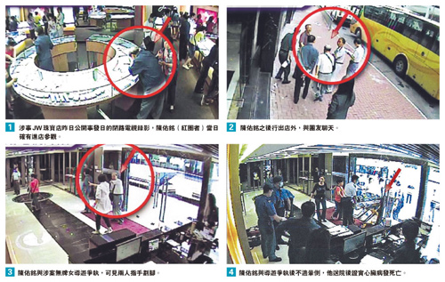 陳佑銘的遺孀、女兒及家屬經(jīng)過極力要求,昨日獲安排到肇事珠寶店翻看事發(fā)時的閉路電視。據(jù)悉,家屬逗留該店半小時,當(dāng)看到職員及導(dǎo)游對陳佑銘的態(tài)度時,家屬一度情緒激動,要由他人扶持下離開。