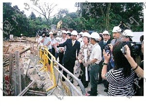 陳麗敏、譚偉文等昨日視察石排灣郊野公園熊貓館建館情況。譚偉文表示,建館工程進度理想,正全力趕工完成基礎(chǔ)土建部分,接著會展開上蓋部分。由于已進入雨季和臺風(fēng)季節(jié),有關(guān)承建單位已作好防風(fēng)雨的準(zhǔn)備工作,盡量減低天氣對工程的影響。以目前情況來看,相信可爭取九月前完成整項工程。