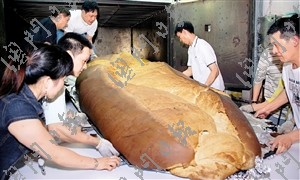 澳門豬扒包遠(yuǎn)近馳名,這次壯舉,由澳門女企業(yè)家與金馬輪咖啡餅店合作,并由金馬輪店焗制。巨型豬扒包長293公分、寬155公分、高33公分,共重540磅,動用面粉200斤、豬扒80磅。從搓面粉、發(fā)酵等工序到最終“面世”,共耗時逾13小時,需7個員工合力制作。