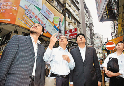六月九日,腐蝕性液體傷人事件發(fā)生后,香港警方繼續(xù)對旺角奶路臣街與西洋菜南街交界處的幾棟嫌疑樓房進行布控,進一步排查疑點,大批香港媒體亦在現場跟蹤報道。 中新社發(fā) 鄭祚聲 攝