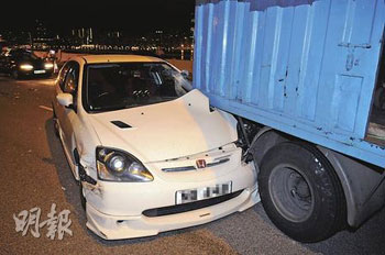 逾20輛經(jīng)改裝的私家車,13日凌晨在被視為香港熱門非法賽車“跑道”之一的觀塘繞道,以160公里時(shí)速狂飆。警方接報(bào)趕至,并事先在繞道上截停5輛普通市民的車輛,作為堵截非法賽車的路障。未幾,10多輛跑車陸續(xù)高速馳駛沖過防線,另有最少3車實(shí)時(shí)掉頭逆線逃去,而5輛被充作“人肉路障”的汽車頓成犧牲品全被撞毀。有挨撞的士司機(jī)不滿警方做法,即場(chǎng)指斥“沒有理由要我們充當(dāng)‘人肉沙包’!”。