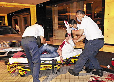 現(xiàn)場為尖東么地道香格里拉酒店門外,4日凌晨4時許,“泰龍”偕一男友人在酒店消遣后離開,行至酒店大門外分頭各自取回一輛名貴平治房車和一輛保時捷跑車,當(dāng)“泰龍”剛走到平治座駕旁,突有2輛車從前后高速駛至,其中一輛7人車從酒店行車通道入口直沖向他,“泰龍”閃避不及被撞至飛彈落地。另一輛私家車則從通道出口逆線駛?cè),車上跳?名分持開山刀殺手,直撲“泰龍”揮刀狂砍。