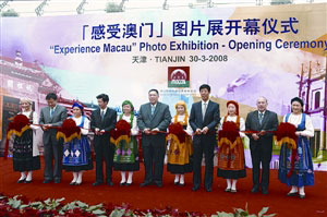 圖片展30日上午9時半在天津博物館開幕,澳門社會文化司司長崔世安,中聯(lián)辦經濟部長周志奎,旅游局長安棟梁,天津市旅游局副局長金鐵林、佟景正等主持開幕儀式。圖片展為期1周,展出20多幅充滿澳門特色的圖片。