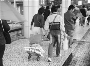 記者2日下午在關(guān)閘口岸觀察,發(fā)現(xiàn)有居民將散裝米放入膠袋,從內(nèi)地運回澳,更甚者是將一大包米放在手拖車上。有居民表示,因經(jīng)常往返珠澳兩地,返澳時會“順道”到內(nèi)地街市買菜,攜帶小量蔬果及大米回家自用。