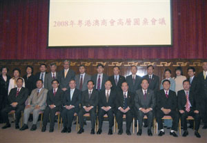 “2008年粵港澳商會(huì)高層圓桌會(huì)議”由香港中華總商會(huì)副會(huì)長林銘森主持。在會(huì)議上發(fā)言的還有:香港中華總商會(huì)會(huì)長霍震寰、廣東省總商會(huì)會(huì)長陳丹、香港工業(yè)總會(huì)主席陳鎮(zhèn)仁等。