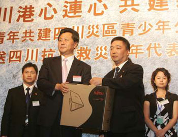 主禮嘉賓、中聯(lián)辦副主任李剛向18個重災(zāi)縣青年志愿者組織贈送了抗震救災(zāi)辦公設(shè)備,以協(xié)助災(zāi)區(qū)重建。
