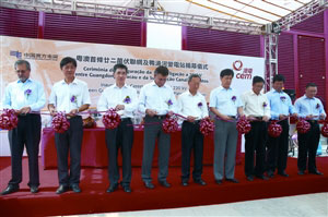 揭幕儀式28日下午3時(shí)在鴨涌河變電站舉行。由澳門(mén)運(yùn)輸工務(wù)司司長(zhǎng)劉仕堯,中聯(lián)辦經(jīng)濟(jì)部副部長(zhǎng)級(jí)助理高尚德,外交部駐澳特派員公署副特派員宋彥斌,能源業(yè)發(fā)展辦公室主任山禮度,中國(guó)南方電網(wǎng)副總經(jīng)理王久玲,廣東電網(wǎng)公司副總經(jīng)理于俊嶺,澳電電力客戶咨詢委員會(huì)主席崔世平,澳電董事會(huì)主席馬兆麟、行政總裁魏立民主禮。