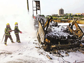 事后,多輛消防車及救護車趕至現(xiàn)場,并迅即開喉灌救撲熄大火,兩車被燒剩支架,救護車將7名大巴乘客送往附近醫(yī)院救治,幸各人傷勢并不嚴(yán)重。受意外影響,廣深公路深圳往廣州方向被迫封閉將近一小時,車龍長達逾一公里。