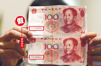 該市民指出,上周在葵涌一間找換店兌換了8張百元人民幣,在內(nèi)地使用時(shí)被拒收,檢查下發(fā)現(xiàn)8張鈔票皆為HD90字頭及編號(hào)順序,當(dāng)中2張?zhí)柎a更完全相同,回港后以驗(yàn)鈔機(jī)檢驗(yàn)其中4張,發(fā)現(xiàn)全是偽鈔。也有市民指出,日前在羅湖過(guò)關(guān)后到大型找換店兌換鈔票,結(jié)果仍換到HD90字頭假鈔。
