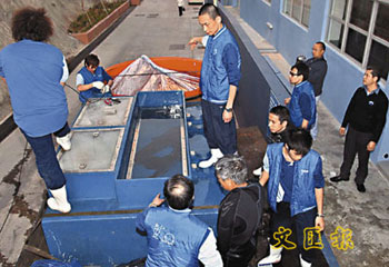 根據(jù)初步檢查結(jié)果,兩尾鱘魚(yú)不僅體內(nèi)有炎癥,體外也有不少擦掛傷口。專(zhuān)家會(huì)診后制定了“針療+藥物潑灑+水質(zhì)調(diào)整”三路并進(jìn)的治療方案,一方面按照每周兩次的頻率為鱘魚(yú)注射抗生素等針劑,同時(shí)每周向繁育池中潑灑2至3次調(diào)配好的粉狀藥物,主要功效都是消炎;刈顬榫o張的水質(zhì)檢測(cè),則指派專(zhuān)人負(fù)責(zé)每日抽樣送檢。