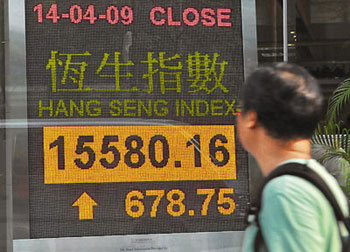 中新網(wǎng)4月15日電 據(jù)香港《文匯報(bào)》報(bào)道,外圍在復(fù)活節(jié)長(zhǎng)假期間,股市持續(xù)向好,令港股14日要追回有關(guān)升幅,恒指高開401點(diǎn)后追貨買盤支撐大市,一眾當(dāng)炒股份向上,全日收?qǐng)?bào)15580點(diǎn),升678.7點(diǎn),升幅達(dá)4.5%,是今年1月7日港股跌穿15000點(diǎn)后,4個(gè)月以來(lái)首次重上15000點(diǎn)收市,且成交續(xù)增至754.21億元。