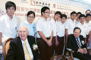 香港中大及新鴻基地產(chǎn)昨日第八度舉辦“新鴻基地產(chǎn)諾貝爾獎得獎學人杰出講座系列”,今年邀請兩名諾貝爾物理學獎得主楊振寧和馬丁•佩爾出席講座,與百多名學生真情對話。有學生提到香港與美國學生的分別時,楊振寧指美國與香港的教學哲學距離甚大,香港學生由小學、中學開始便會操練數(shù)學,數(shù)學較理想。他又推薦年輕人閱讀《雙螺旋》,故事講述一名年輕人努力不懈,最后成功發(fā)表“雙螺旋”理論,獲得諾貝爾生物獎。