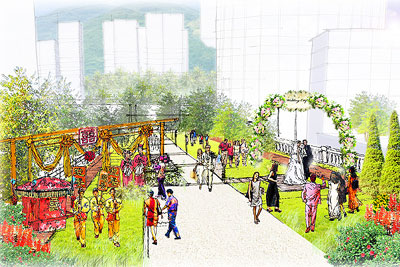 “姻園”的設(shè)計(jì)和布置都圍繞婚嫁這一主調(diào),并提供約30,000平方呎凈樓面的零售用地。除了喜帖店鋪,該處還提供與婚嫁有關(guān)的商品和服務(wù),包括婚紗、禮服、鮮花、禮餅、發(fā)型屋、珠寶首飾、影樓、房車租賃、婚宴舞會(huì)統(tǒng)籌服務(wù),以及場(chǎng)地布置等。毗連“姻園”的部分空地也有切合婚嫁主題的裝飾布置和藝術(shù)雕塑品擺設(shè)。