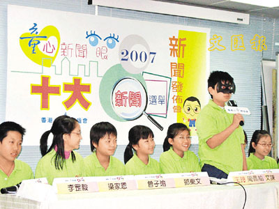 負責(zé)舉辦選舉的香港小童群益會第4屆“香港小特首”,上月分別通過表格及網(wǎng)上投票進行“童心新聞眼2007十大新聞選舉”,吸引28996名小四到中三學(xué)生參與投票,從30則候選新聞中選出心中的十大新聞,榮獲首3名的新聞依次為“熊貓‘盈盈’、‘樂樂’抵港 慶祝回歸10周年”、“哈利波特大結(jié)局 風(fēng)靡全球”及“嫦娥一號發(fā)射成功 探月夢想逐步成真”,分別取得18172票、16474票及15054票。