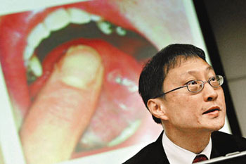 五月七日,香港衛(wèi)生署衛(wèi)生防護(hù)中心就近期流行的腸病毒EV-71型感染及手足口病的最新情況特別舉行記者會,衛(wèi)生防護(hù)中心總監(jiān)曾浩輝醫(yī)生于會上向傳媒介紹本地及鄰近周邊地區(qū)的最新情況。圖為曾浩輝醫(yī)生展示衛(wèi)生署印制了相關(guān)的宣傳海報,加強(qiáng)對兒童個人衛(wèi)生的宣傳。 中新社發(fā) 鄧慶樂 攝
