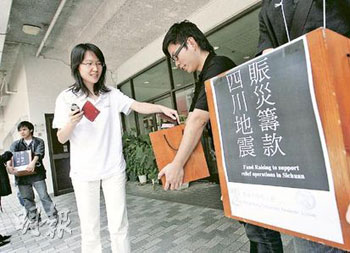 中新網(wǎng)5月15日電 據(jù)香港明報(bào)報(bào)道,四川災(zāi)情嚴(yán)峻,港人紛紛捐款賑災(zāi),短短兩日,中聯(lián)辦已收到香港各界逾1.3億元捐款。不同界別各出其謀籌款,香港教育界呼吁全港所有中小學(xué)生捐10元、教師捐100元賑災(zāi)。