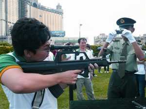圖:學(xué)生手持自動(dòng)步槍照相。(圖片來(lái)源:澳門日?qǐng)?bào))