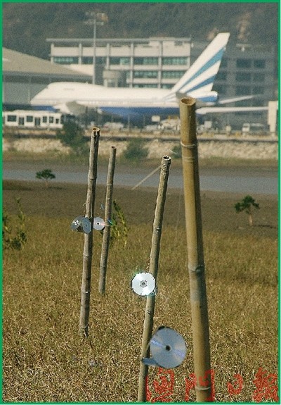 民署為免雀鳥在堆填區(qū)和淺灘覓食,到處亂飛而影響航班升降,18日上午派出工程人員在堆填區(qū)架設(shè)由回收光盤組成的反光裝置。該反光裝置由四片組成一個(gè)三角錐體,再以一條魚絲懸空吊在竹枝上,反光裝置可隨風(fēng)飄揚(yáng),將陽光向四周折射,干擾雀鳥活動(dòng),從而驚嚇雀鳥。