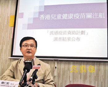 賴仁彪說:“根據(jù)以往針對高危人士及低收入人士的流行性感冒防疫注計劃,在特區(qū)政府免費的資助及號召下,接種針數(shù)達(dá)27萬針,與現(xiàn)時8萬針相差很大!弊罱K若由特區(qū)政府免費為兒童打針,他相信接種率可提升至90%。