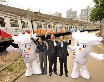 中新網(wǎng)3月20日電 據(jù)香港特區(qū)政府網(wǎng)站消息,香港民政事務(wù)局局長曾德成19日前往港鐵公司柴灣車廠,視察以香港2009東亞運(yùn)動(dòng)會(huì)的徽章、口號(hào)、吉祥物和23項(xiàng)比賽項(xiàng)目為裝飾的列車。